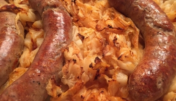 Нарязваме киселото зеле на едро и го слагаме в гювеча. В сух тиган запечатваме сланината от двете страни на силен огън и я добавяме към зелето. Суровата наденица я добавяме в гювеча. Подправяме с дафинов лист.